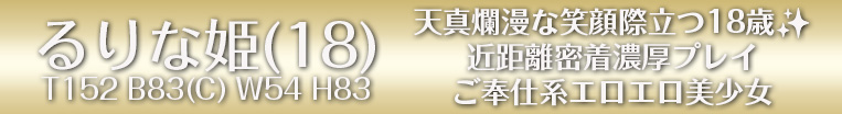 ~18歳!!洗練されたルックスのチョイギャル系スレンダー美少女登場!!~ ☆天真爛漫な笑顔も魅力的な18歳!超キレカワ美少女『るりな姫』デビュー!!明るくて愛嬌抜群な彼女はいちゃいちゃ大好きな悶絶必至の唾液たっぷりフェラでご客様をご奉仕するエロエロ美少女!!『るりな姫』の近距離密着濃厚プレイを是非ご堪能ください!!☆ ………………………………… るりな姫特別オプション ・パンティー持ち帰り ・写真撮影 ・動画撮影 ・3P(男1、女2) ※詳しくはお電話にてお気軽にお問い合わせ下さい。 ………………………………… 【ルックス】 出会った瞬間に衝撃!!小さなお顔に整った目鼻立ちが、間違いなくお客様の心を鷲掴みにしてしまいます!!アイドルのような可憐なルックスと爽やか笑顔に確実にハマってしまう事でしょう!! 【スタイル】 すみずみまでお手入れの行き届いた、若く輝かしい美白肌にエッチな細身のプロポーション!!これは興奮を抑える事はできません!!引き締まっていて、それでいて女の子らしい柔らかさのある、見事なまでのスレンダーな肢体をご堪能ください!! 【性格】 誰もが愛さずにはいられない明るく人なっこいタイプ♪常に笑顔を絶やさない愛嬌抜群の『るりな姫』といれば、心も体も元気とエロスに満たされ、本気で癒されてしまう事でしょう!!そのエッチで不思議なオーラを是非ともご賞味くださいませm(__)m 【店長から一言】 超キレカワなルックス!!華奢でしなやかなスタイル!!スレンダー美BODYな美少女が大好きなお客様には文句無しの逸材『るりな姫』デビュー!!必ずや心を射止められてしまうであろう、その可愛すぎなルックスは、誰もが出会った瞬間に衝撃と感動を感じていただける事でしょう!!バランスの取れた小柄な152センチの美しい肢体は、くびれたウエストや引き締まったヒップ、細くスラリと伸びた美脚とまさに天下一品のスレンダー美BODYであるとここに明言致します!!よく笑う元気いっぱいな18歳美少女ですが、実はかなりエロいというギャップがマジで嬉しい!!イチャイチャしながらエッチなモードに突入~の彼女でしか味わえない愛嬌&エロスが満天な世界を是非ぜひお楽しみくださいませ!! 【お客様の声】 ■只今リサーチ中